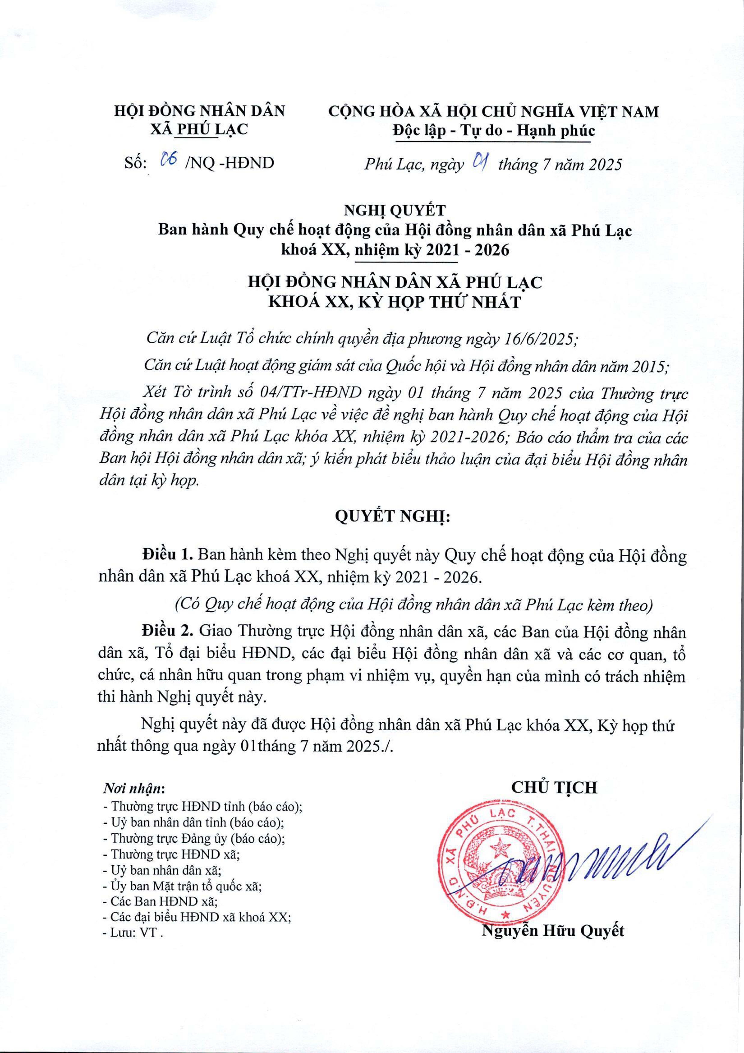 NQ Ban hành Nội quy kỳ họp HĐND xã Phú Lạc Khóa XX, nhiệm kỳ 2021-2026